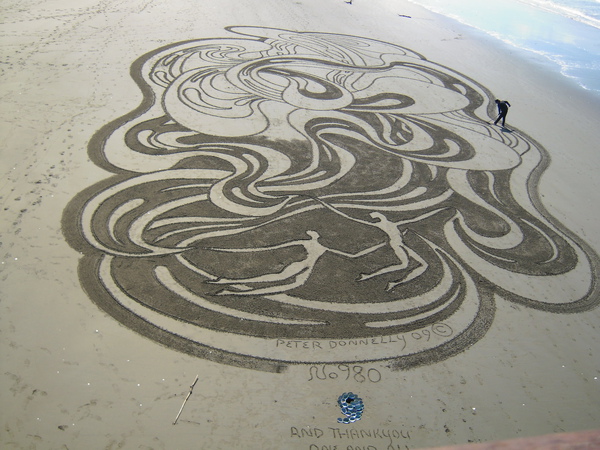 今天是星期六, 所以在沙灘上有不少人. 有的人去玩水或曬太陽. 可有位老兄居然在畫畫. 畫什麼鬼咧, 請看. 其實我也看不太懂他的藝術, 請大家告訴我他在寫什麼吧?